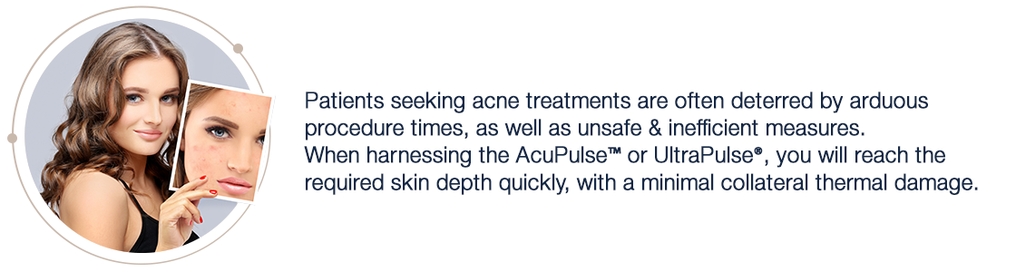 Furthermore, patients seeking acne treatments are often deterred by arduous procedure times, as well as unsafe and inefficient measures. When harnessing the AcuPulse™ or UltraPulse®, you will reach the required skin depth quickly, with a minimal collateral thermal damage.