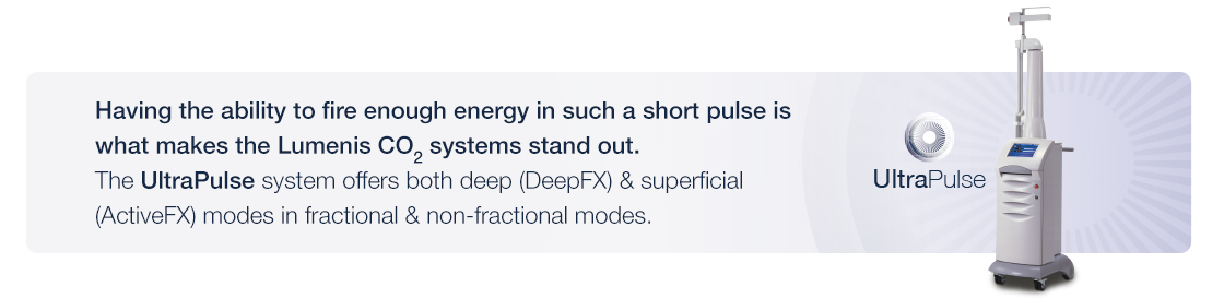 More affordable access to fractional CO2 technology has boosted its popularity in laser therapy for skin resurfacing for both skin care physicians and patient procedures. It’s important to know which system is best for your patients before investing in a new fractional CO2 “lasabrasion” device since not all CO2 systems are the same. When treating with CO2 lasers, the tissue requires a minimum ablation threshold energy of 5 joules per cm2 in less than one ms, having the ability to fire enough energy in such a short pulse is what makes the Lumenis CO2 systems stand out. The UltraPulse system offers both deep (DeepFX) and superficial (ActiveFX) modes in fractional and non-fractional modes.