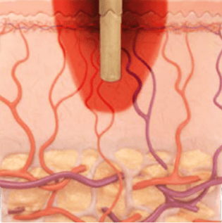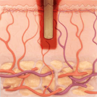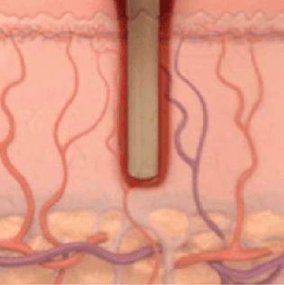 CO2 lasers produce light at a 10,600nm wavelength, which is absorbed by water molecules in the tissue. The laser energy heats up the water until it reaches a boiling point, causing the evaporation of the affected tissue. Some of the heat is absorbed by the tissue adjacent to the ablated target area, causing tissue coagulation which induces hemostasis (the cessation of bleeding) as well as thermal stimulation of deep skin layers, which induces fibroblast stimulation and neocollagenesis (the formation of new collagen).