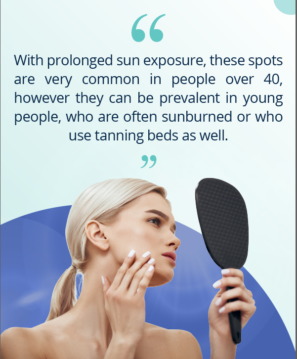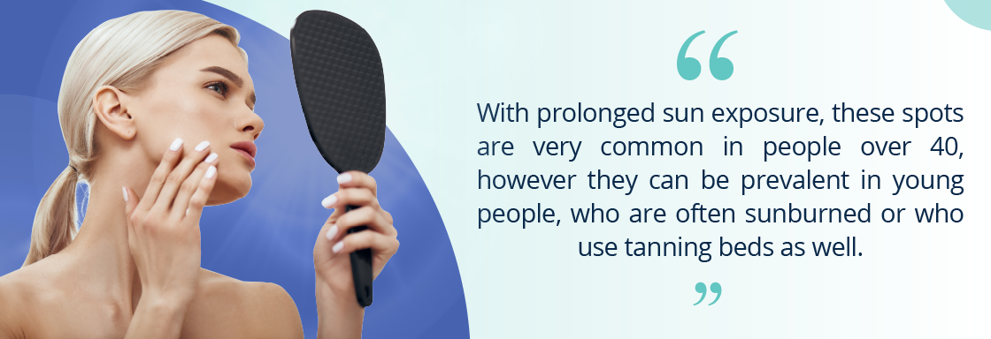 With prolonged sun exposure, these spots are very common in people over 40, however they can be prevalent in young people, who are often sunburned or who use tanning beds as well.
