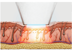 Происходит компрессия кожи. Лазерный луч поступает в кожу, повреждая цель.
